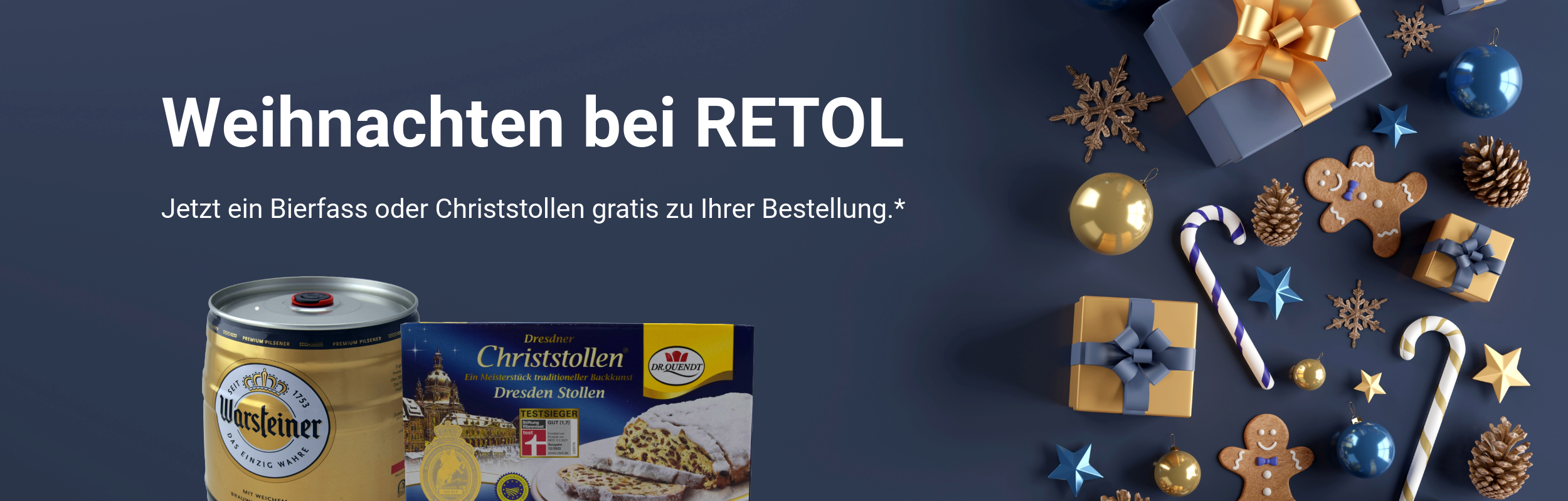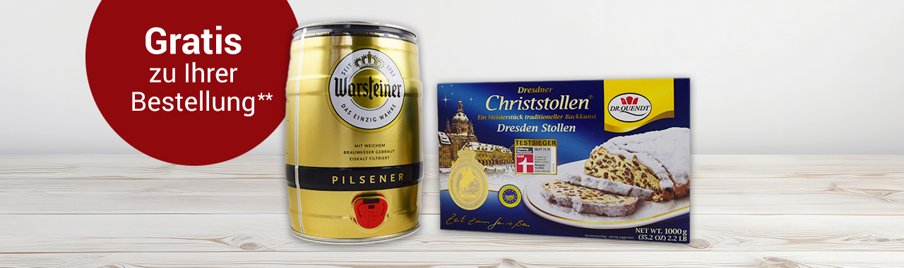 **Für eine Bestellung im Wert von 250€ netto (297,50€ brutto) erhalten Sie wahlweise gratis ein Warsteiner Partyfass - oder einen Original Dresdner Christstollen dazu. Je Kunde wird nur eine Gratiszugabe abgegeben. Nur solange der Vorrat reicht.